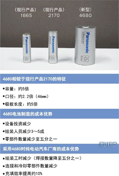 将在和歌山工厂开始量产的新型LIB“4680”与目前主流的“2170”的能量密度几乎没有变化,但容量达到目前的5倍左右,可以大幅减少安装在纯电动汽车上的电池数量(图2)。因此,随着封装之际的组装工时减少、电池之间的连接部位减少使得零部件数量减少等,涉足纯电动汽车的汽车企业方面的成本有望降低。对于电池厂商来说,零部件个数减少和组装人员减少等可以降低电池单元的制造过程中的成本。